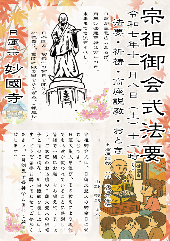 「宗祖御会式法要」「月例鬼子母神祭」を開催します🤗